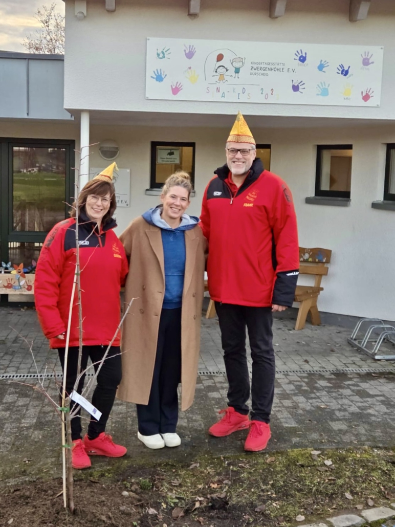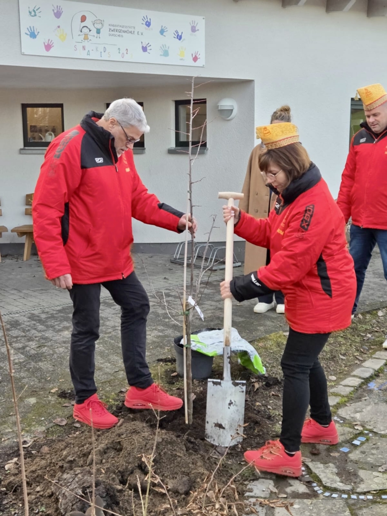 Wir hatten diese Woche hohen Besuch in der Zwergenhöhle. Das Prinzenpaar der KG Dürscheider Mellsäck e.V. gab sich die Ehre und mit ihnen kam ein neuer Baum für unseren Vorgarten. Die Karnevalsgesellschaft spendet uns einen Zwetschgenbaum – dieser wurde dann auch gleich vom Prinzenpaar eingepflanzt. Unsere Leitung Nina Gründel hat stellvertretend ihren Dank für diese tolle Spende ausgesprochen. Vielen Dank an die KG Dürscheider Mellsäck für die „Zwergenzwetschge“, die ab jetzt den Garten vor der Zwergenhöhle ziert und hoffentlich dann bald irgendwann auch Zwergenzwetschgen abwirft.